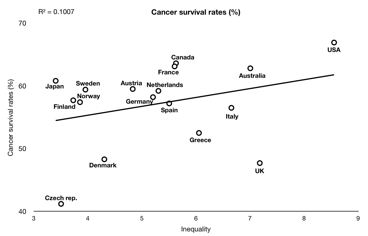 Agreed. It would be very surprising if increased inequality increased the cancer survival rate at all. The graph is here only to show that cancer survival is not higher in more equal countries, something that some people apparently would not find surprising. The r-squared of .10 is fairly typical of 'correlations' with the other criteria though.